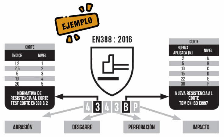 • Los cuatro primeros números determinan el nivel de abrasión, corte, desgarro y punzamiento. Todos ellos pueden tener un nivel de 1 a 4, salvo el corte que tiene del 1 al 5.